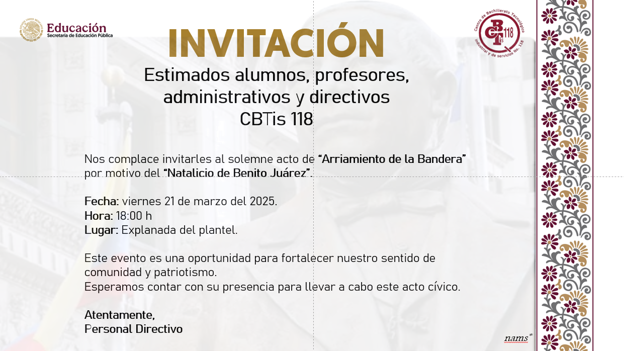 Nos complace invitarles al solemne acto de “Arriamiento de la Bandera” por motivo del “Natalicio de Benito Juárez”.