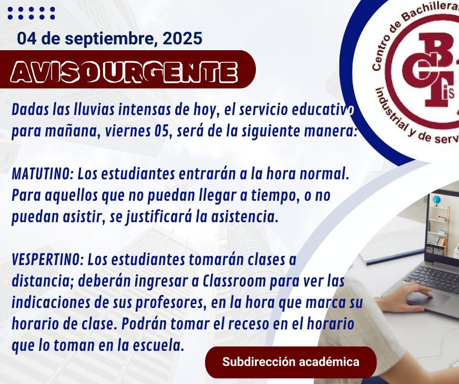 - TURNO VESPERTINO. Considerando que lo único que tenemos es un pronóstico, pero no la seguridad de la lluvia, y no podemos salir con anticipación si llueve, hemos decidido que los estudiantes del vespertino tomen clases a distancia, con las siguientes consideraciones: