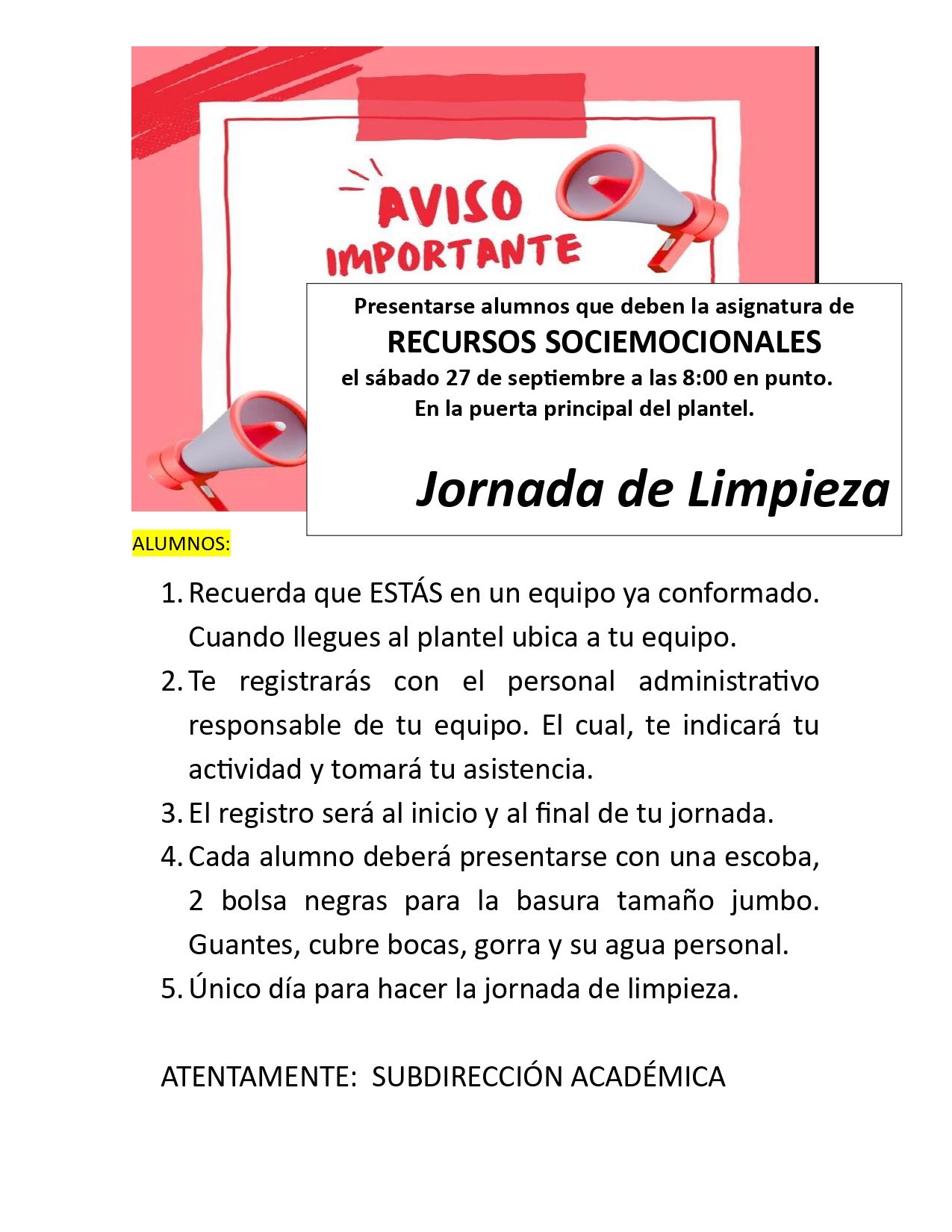 PROGRAMA 4 DE RECUPERACIÓN DE LA UAC "FORMACIÓN SOCIOEMOCIONAL: "LIMPIEZA DE ÁREAS ESTRATÉGICAS DEL PLANTEL".