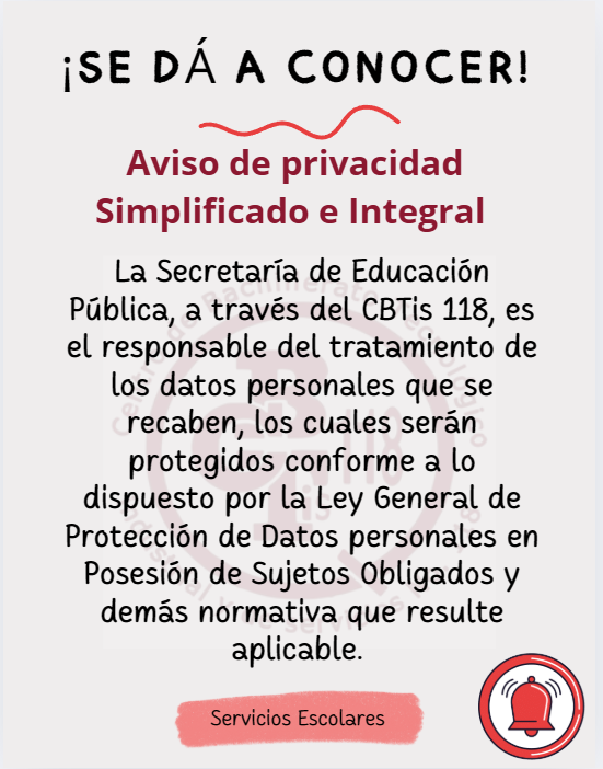 La Secretaría de Educación Pública, a través del Centro de Bachillerato, Tecnológico, industrial y de servicios no. 118, adscrito a la Dirección General de Educación Tecnológica industrial y de servicios (DGETI), con domicilio en Paseo Constituyentes Poniente S/N, Colonia Corregidora, c.p. 76900. Corregidora, Qro. , es el responsable del tratamiento de los datos personales que se recaben, los cuales serán protegidos conforme a lo dispuesto por la Ley General de Protección de Datos Personales en Posesión de Sujetos Obligados (LGPDPPSO) y demás normatividad que resulte aplicable.